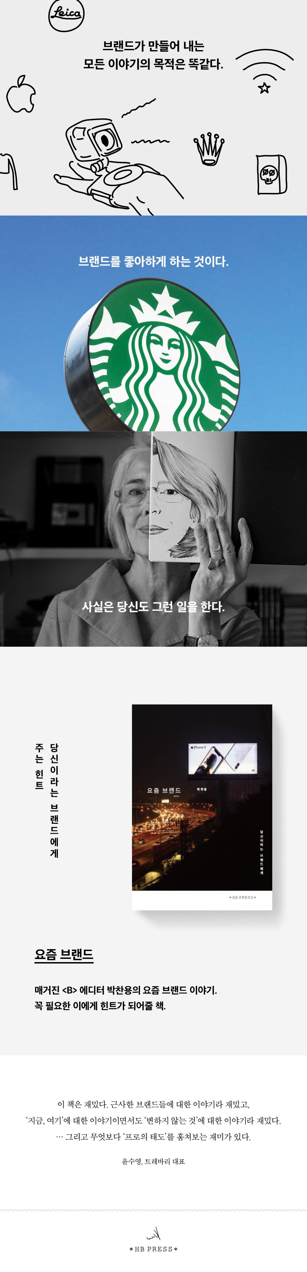 지은이: 박찬용 | 출판사: 에이치비 프레스 | 출간일: 2018년 11월 9일 | ISBN: 979-11-964939-0-5 | 가격: 14,000원 | 분량: 308쪽 | 크기: 128x188mm |분야: 경제경영, 브랜드 스토리