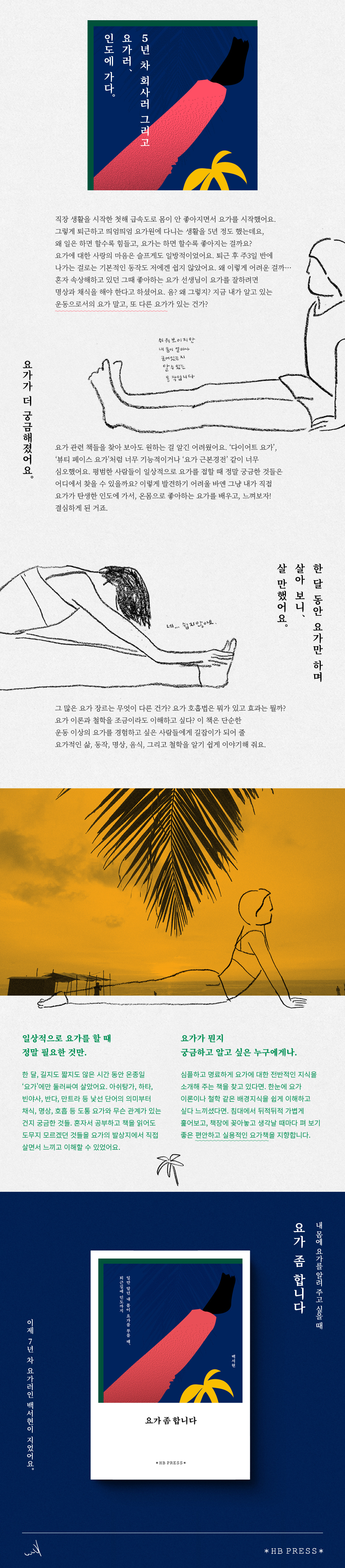 ‘요가 좀 합니다’는 7년 차 직장인 요가러가 하루종일 요가 좀 하러 인도에 가서 겪은 두 번째 요가 입문기이다. 지나치게 실용적인 요가 가이드북에 흥미를 느끼기 어려웠던 사람이라면, 함께 요가하는 동료가 이야기해 주는 것처럼 좀 더 깊고 솔직한 이 책이 도움이 될 것이다.
